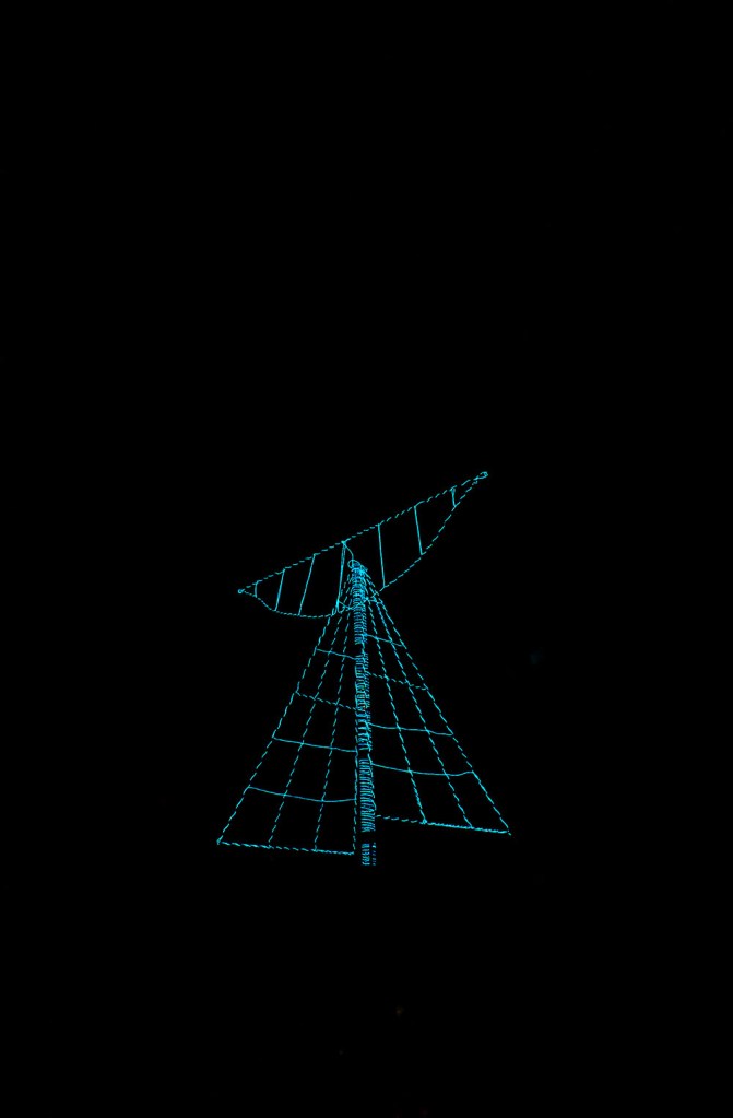 The lines of steel and glow wire create a shape of a 19th century ship main mast.