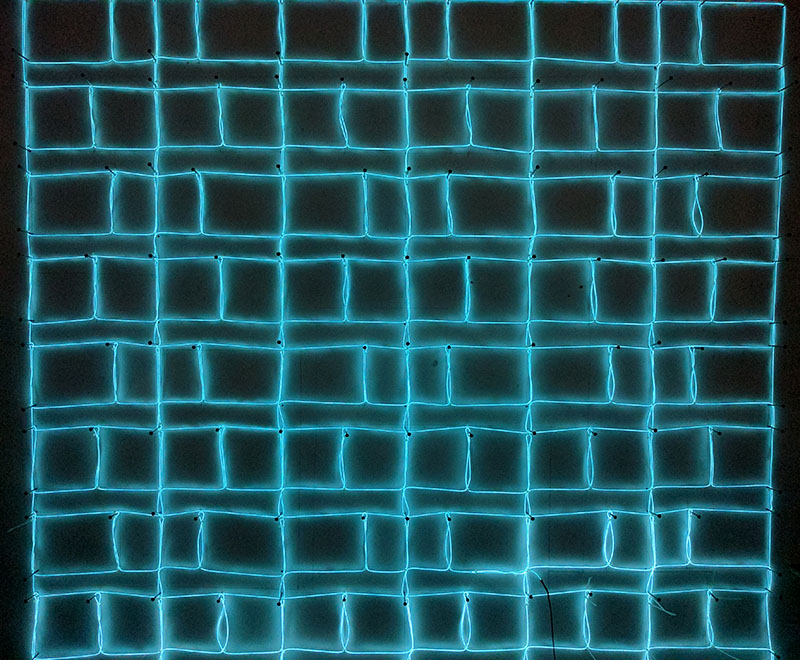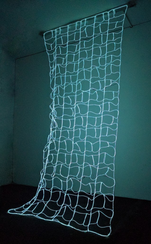 “The Net” uses architectural line patterns from London housing, looking at council estates in particular. It explores the repetitive nature of affordable housing, where an estate can be compromised from several identical buildings or even clone estates exist in different parts of the city. The artist explores this form of repetition in relation to mass production and the pluses and minuses of these aspects. A certain consideration is taken to the colours used in council estates that will often be light shades of blue or green that are supposed to be calming colours, therefore implying expected violent activity in certain areas of the city.